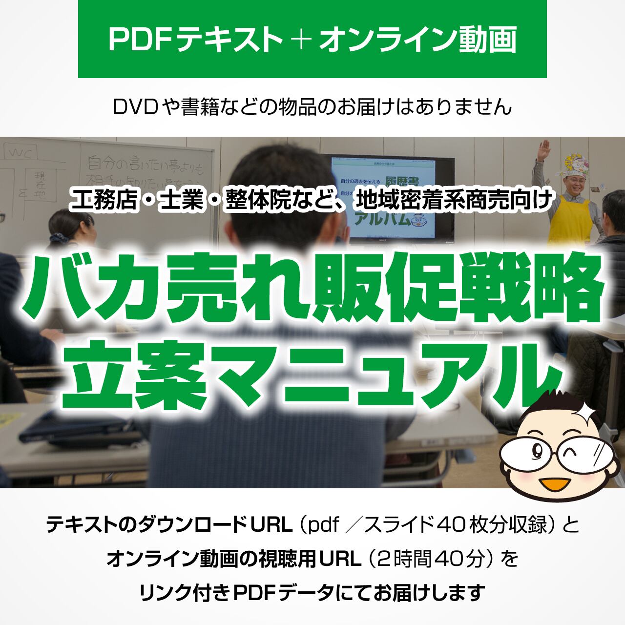 ☆工務店さん、士業さん、整体院さん、教室さん、駆け付けサービスさんなど、地域密着系の事業を営む小規模事業者さんに人気のセミナー「バカ売れ販促戦略立案講座」のテキスト&動画映像の教材販売です。